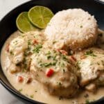 This Miso-Coconut Poached Cod with Pandan Rice is a fragrant and flavorful dish combining tender cod poached in a rich miso-coconut broth, paired with aromatic pandan-infused jasmine rice. The jasmine rice is lightly sautéed with shallots, garlic, and ginger before cooking with pandan leaves and savory chicken stock, imparting a delicate fragrance. The cod is gently poached in a spiced broth of white miso, coconut milk, ginger, garlic, Thai chili, and fish sauce, enriched with lime zest and juice for a bright finish. This dish expertly balances creaminess, umami, and subtle heat for an elegant, wholesome meal.
