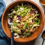 Place the drained Napa cabbage in a large serving bowl, add the snow peas, radicchio, and scallions, then slowly drizzle in half the dressing. Toss gently but thoroughly to coat everything. Taste it — you might want a little more dressing, which is totally fine. Just add gradually so you don’t overdress. Right before serving, sprinkle toasted almonds and, if you’re feeling playful, some wonton chips for that extra crunch.