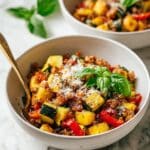 In the same skillet, toss in your diced onion and garlic. Sauté for about 2-3 minutes until they’re soft and fragrant — this builds a delicious flavor base for your veggies and sauce. Next, add zucchini, yellow squash, red bell pepper, and eggplant. Cook everything together, stirring occasionally, until the veggies soften, about 5-7 minutes. Don’t rush this step; well-cooked veggies give the skillet a great texture and taste.