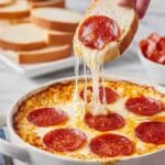 This Pepperoni Dip with Cheese and Marinara is a warm, savory appetizer perfect for gatherings. Creamy cream cheese and sour cream blend with parmesan and mozzarella cheeses, seasoned with Italian herbs and spices, then topped with spicy pepperoni slices and marinara sauce for a deliciously melty, flavorful dip that pairs perfectly with bread, crackers, or vegetables.