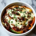 This Philly Cheesesteak Bowls recipe offers a delicious and satisfying twist on the classic sandwich by serving tender sirloin steak, sautéed bell peppers, onions, and mushrooms baked with a savory sauce and melted provolone cheese, all served over fluffy rice. It’s an easy one-pan meal perfect for a quick weeknight dinner or meal prepping for the week.