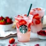 I don’t freeze the full Pink Drink since the coconut milk and sparkling water can separate or lose their texture on thawing. However, you can freeze the brewed passion tea and frozen strawberries in ice cube trays to save time next time you want to make this recipe. Just thaw and add coconut milk and sparkling water fresh.