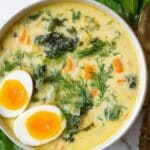 Polish Sorrel Soup with Hard Boiled Egg, also known as Zupa Szczawiowa, is a vibrant and tangy green soup made with fresh sorrel leaves, potatoes, carrots, and aromatic herbs. This traditional Polish dish is enhanced with creamy sour cream and served topped with sliced hard-boiled eggs, offering a refreshing and comforting experience perfect for spring and summer meals.