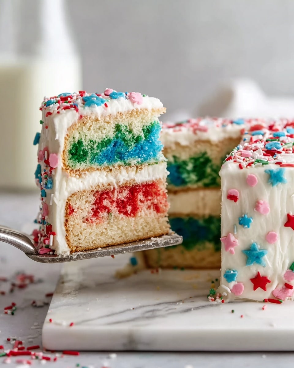 This colorful cake pairs beautifully with a scoop of vanilla ice cream or a dollop of fresh whipped cream on the side. For a refreshing pairing, I like serving it alongside fresh seasonal berries or a simple fruit salad which balances sweetness and cuts through the creamy texture.