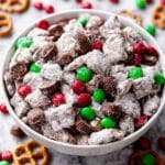 This festive Reindeer Food Recipe, also known as Christmas Puppy Chow, combines crunchy Rice Chex cereal, pretzels, and colorful M&Ms in a rich chocolate peanut butter coating, then dusted with powdered sugar for a perfect holiday treat that’s sweet, salty, and irresistibly crunchy.