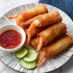 One of my favorite timesavers is freezing these wrapped shrimp before frying. Just assemble as usual, freeze them on a tray in a single layer until firm, then transfer to a freezer bag. When ready, you can fry from frozen—just add a little extra time to cooking.