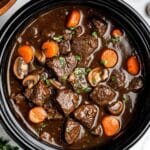 For a special occasion, I like serving Slow Cooker Beef Bourguignon Recipe in individual ramekins topped with a sprig of thyme or a swirl of sour cream. Another time, I spooned it over a puff pastry round to make an elegant beef pot pie-style presentation. It never fails to impress guests!