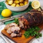 Keywords: Greek lamb roast, slow roast lamb, lemon lamb recipe, roasted potatoes, Mediterranean lamb, honey mustard marinade