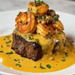 This Steak, Shrimp & Lobster Sauce recipe combines perfectly seared filet mignon steaks with succulent shrimp and lobster tails in a rich, creamy lobster sauce infused with garlic, smoked paprika, and white wine. Ideal for an indulgent surf and turf meal, this dish balances the robust flavors of beef with delicate seafood and a luxurious sauce, perfect for a special dinner.