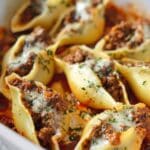 This delicious Stuffed Shells with Meat recipe features jumbo pasta shells filled with a savory ricotta and spinach mixture, topped with a hearty homemade meat sauce made from Italian sausage and ground beef, then baked to perfection with melted mozzarella cheese. Perfect for a comforting family dinner or special occasion.