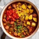 Start by heating a large pot over medium-high heat. Add your ground beef and sliced kielbasa, cooking until everything is nicely browned. Don’t rush this part—it builds a good foundation of flavor. Once browned, drain any excess grease, then toss in the chopped onion and minced garlic. Sauté these until they’re soft and fragrant, around 3-4 minutes. This step is crucial because that caramelized onion and garlic aroma sets the tone for the entire stew.