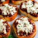 Take the baking tray out of the oven and spoon a generous portion of the sloppy joe mixture onto each slice (about half a cup each). Then mound about ¼ cup of shredded mozzarella cheese right in the center—the cheese will spread as it melts, covering the sloppy joe without dripping over the edges. Pop the tray back in the oven for another 3 to 4 minutes so the cheese melts perfectly and the toast finishes baking.