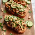 Layer the toasted bread with your hoisin chicken mixture, scatter the dry roasted peanuts on top for that addictive crunch, and add cucumber slices to bring in a hit of freshness. Throw on the mint, green onion, and cilantro leaves, then drizzle generously with the chili-garlic mayo. Serve immediately to enjoy the contrast between crunchy, soft, spicy, and fresh.