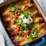 - Rest and Serve: Remove from oven and let the enchiladas rest for 5-10 minutes before serving. Garnish with the reserved green scallion tops and optional toppings such as cilantro, avocado, guacamole, sour cream, crema, or diced red onion.