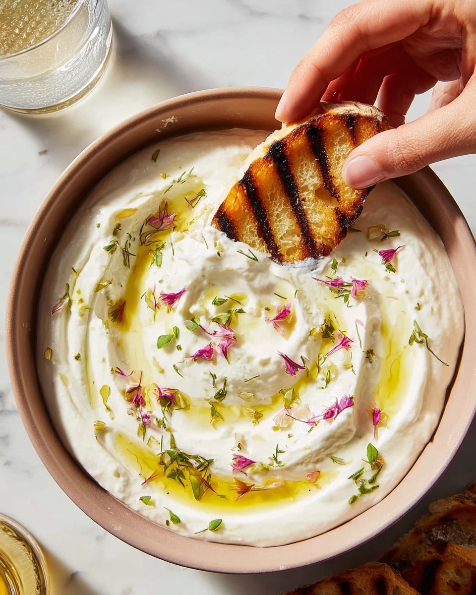 Whipped Ricotta Crostini is a light and creamy appetizer featuring smooth whipped ricotta cheese seasoned with lemon juice, olive oil, and sea salt. Served atop grilled baguette slices and finished with a drizzle of honey, fresh lemon zest, thyme leaves, and flaky sea salt, this elegant crostini offers a perfect balance of tangy, sweet, and savory flavors, ideal as a sophisticated starter or snack.